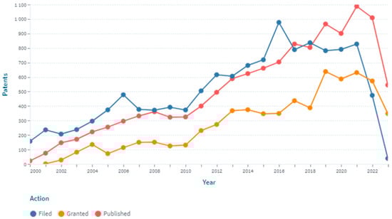 Patent analysis using a search query of the study revealed 12,143 patents and 4990 simple families for the period from 2000 to 2023 (as of 31 August 2023). The dynamics of patenting inventions in the field of creating pulse oximeters in 2000–2023 are shown in Figure 3.
