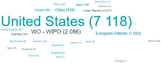 Figure 4 shows the patenting activity in the field of creating of pulse oximeters in various countries. An analysis of the Lens patent database showed that the leading countries issuing patents on their territory were the United States, China, the Republic of Korea, Japan, Canada, Australia, Taiwan, and the United Kingdom. Applicants also made extensive use of the Patent Cooperation Treaty and a procedure for obtaining European patents.