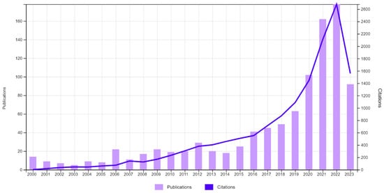 Dynamics of the number of publications and citations devoted to pulse oximetry using digital technologies in the Web of Science (2000–2023, as of 31 August 2023).