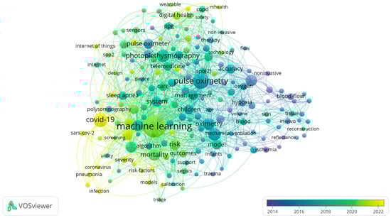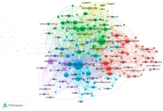 A conceptual map of the keywords of publications on pulse oximetry using digital technologies in Web of Science (2000–2023, as of 31 August 2023).