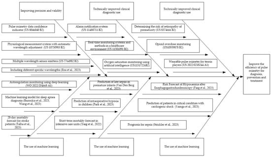 Of particular interest is the development of Covidien Lp, protected by the patent “Oxygen Saturation Monitoring Using Artificial Intelligence” (US11517226) []. The developed oxygen saturation-monitoring device determines that the oxygen saturation level of the patient has decreased before reaching the desaturation threshold and can predict whether the oxygen saturation level of the patient will rise again above the desaturation threshold within a predetermined period.