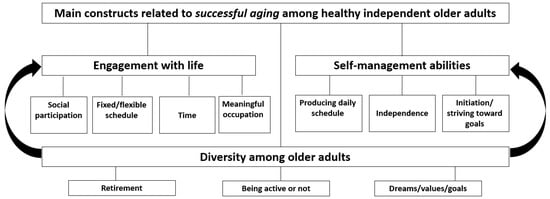 Three categories were identified from both focus groups and interviews regarding successful aging among healthy, independent older adults in the context of engagement in social and productive activities: (a) engagement with life, concepts related to daily activities and participation in life, including social participation, fixed/flexible schedule, time, and meaningful occupation; (b) self-management abilities, indicating the person’s ability to direct and manage their aging process and participation in activities; this category includes producing daily schedules, independence, and initiation/striving toward goals; and (c) diversity among older adults, including their different viewpoints on concepts such as retirement, being active or not, and their dreams/values/goals (Figure 1). This third construct is also expressed by the differences among older adults in the other two constructs.