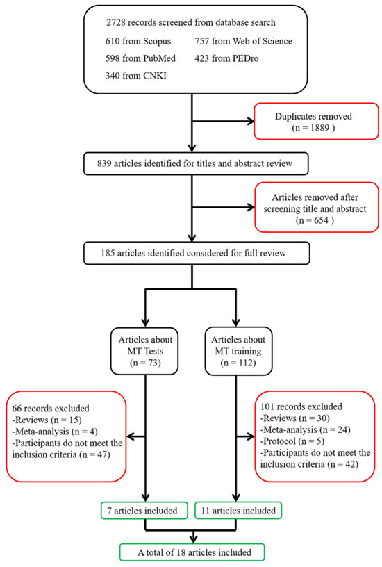 A total of 2728 articles were identified through an extensive literature search. After removing duplicates, 839 studies were retained. Further screening was conducted by reviewing the title and abstract of the literature, and 185 articles were obtained. After reading the full text of 185 articles, a total of 18 articles were selected following different routes of the process, of which 7 were related to MT testing and 11 were related to MT training (see Figure 1).