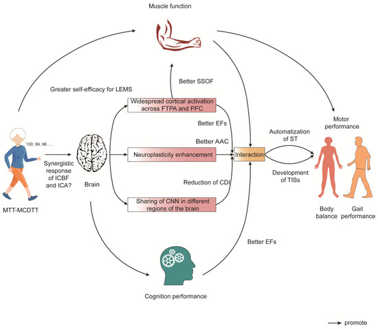 Potential mechanisms of the effects of MT training on frail older adults (AAC, attentional allocation capacity; CDI, competitive demands interference; CNN, complex neural networks; EFs, executive functions; FTPA, fronto-temporo-parietal areas; ICA, increase in cerebral angiogenesis; ICBF, increase in cerebral blood flow; LEMS, Lambert–Eaton myasthenia syndrome; MCDTT, motor-cognitive dual task training; MTT, multitask training; PFC, prefrontal cortex; SSOF, sensory system organs function; ST, single task; TISs, task-integration skills).