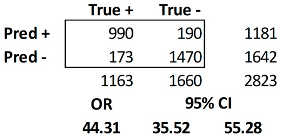 In 13 articles, effect size was not reported, which eliminated them from the meta-analysis. In 15/28 studies (54%), sufficient data were provided to conduct a meta-analysis. The necessary fields were specificity, sensitivity, F1, odds ratio, Pearson’s r, and Cohen’s d for effect size. Ten articles reported sensitivity and specificity [17,19,20,26,28,30,33,38,39,42]. The overall sensitivity was 0.8516, specificity was 0.8853, precision (PPV) was 0.8388, accuracy was 0.9074, F1 = 0.8452, OR = 44.31 CI [35.53, 55.28]. The confusion matrix is illustrated in Figure 2. True positives, false negatives, true negatives, and false positives were collected, and odds ratios were calculated. All were converted to Cohen’s d [15,16]. The weighted average effect size was = 0.7339, which is a medium effect size that approaches a large effect size. This means the weighted average effect size has a strong medium effect: health information technology interventions can diagnose AD using non-invasive methods. The full table and calculations are listed in Appendix C.