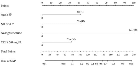 We developed a nomogram based on the regression coefficients of the SAP prediction model, the logit model (Figure 2). Among the risk factors, the risk factor with the highest regression coefficient and the greatest impact was nasogastric tube feeding, which was assigned 100 points, and the remaining risk factors were assigned points in proportion to the regression coefficient of nasogastric tube feeding, such as 41 points for age ≥ 65 years, 42 points for NIHSS score ≥ 7, and 32 points for CRP ≥ 5.0 mg/dL. The sum of the scores of the risk factors in the nomogram indicated the probability of SAP.