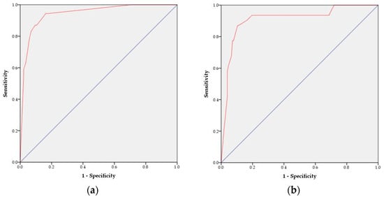 ROC curves of the SAP risk prediction nomogram: (a) development stage and (b) validation stage. The red line represents the ROC curve. The blue line represents the diagonal reference line.