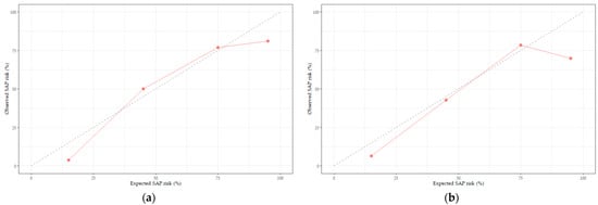 Calibration plots of the SAP risk prediction nomogram: (a) development stage and (b) validation stage. The diagonal dashed line represents the perfect calibration line. The red line represents the predicted probability versus the observed probability.