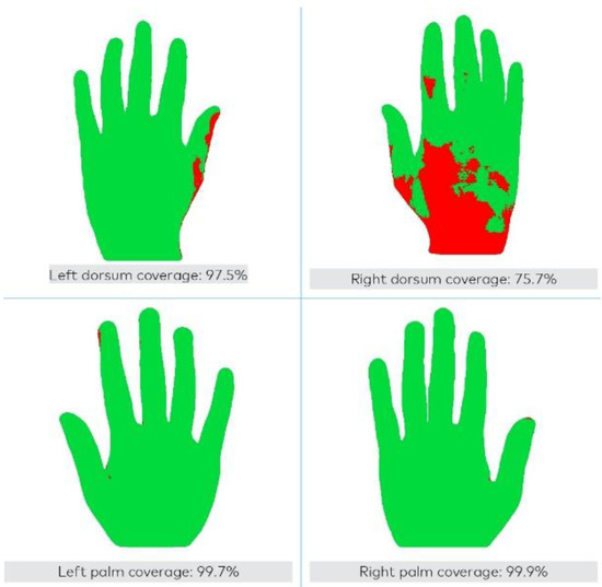 - Zingg, W.; Haidegger, T.; Pittet, D. Hand coverage by alcohol-based handrub varies: Volume and hand size matter. Am. J. Infect. Control 2016, 44, 1689–1691. [Google Scholar] [CrossRef]