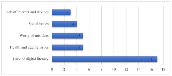 Central barriers identified by our participants were categorized into digital literacy, technical support, worry about mistakes, health, and social barriers (Figure 1). The top issues mentioned were related to a lack of digital literacy, which negatively impacts the intention to use mHealth effectively. As one participant stated, “Main barrier if the elderly does not know how to use the device”. This underscores the apprehension some older adults may have regarding their technological proficiency and the challenges they anticipate. Some participants expressed concerns about health and age-related issues that prevent them from using mHealth technology: “Health challenges, such as poor eyesight, may be the reason that prevents you from using the technology”. Another participant expressed, sadly, an inability to remember: “If I practiced it, I might forget how to use it later”. Social and cultural factors related to convincing the elderly about mHealth emerged as a barrier. One interviewee highlighted, “The problem is in culture and the culture of ignorance. It is possible that the elderly person is ignorant and refuses to learn”. Fearing to make mistakes while using mHealth technology was stated as a barrier, particularly among uneducated elderly, as mentioned by one participant: “…it is that part of them is afraid of making mistakes when they use it”. The last barrier mentioned was related to the availability of internet connection and appropriate devices. As one participant stated, “the lack of availability of the device, and this leads to meeting the doctor in person, as well as the lack of Internet in the desert areas”.