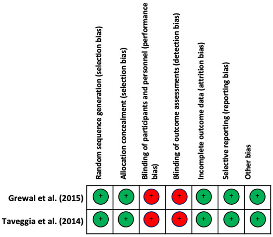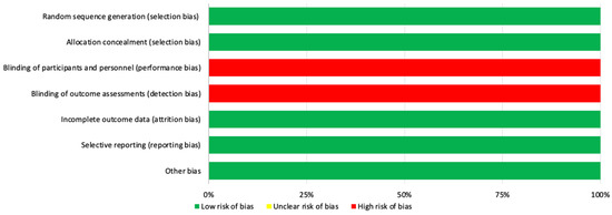 - Higgins, J.P.; Altman, D.G.; Gøtzsche, P.C.; Jüni, P.; Moher, D.; Oxman, A.D.; Savović, J.; Schulz, K.F.; Weeks, L.; Sterne, J.A.C. The Cochrane Collaboration’s tool for assessing risk of bias in randomised trials. BMJ 2011, 343, d5928. [Google Scholar] [CrossRef] [PubMed]