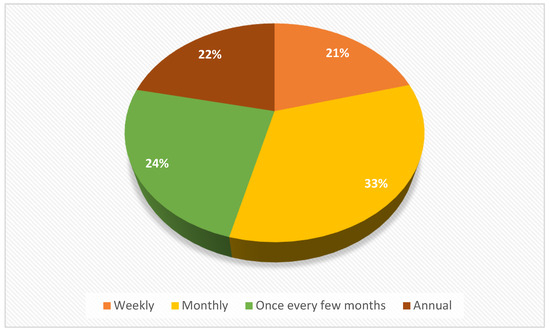 Over 33% of all the patients who filled out the questionnaire responded that the frequency with which they go to the pharmacy for prescriptions or to buy OTCs or dietary supplements was monthly (Figure 6). That percentage can be explained by the monthly collaboration that chronic patients have with family doctors and their routine for receiving prescriptions.