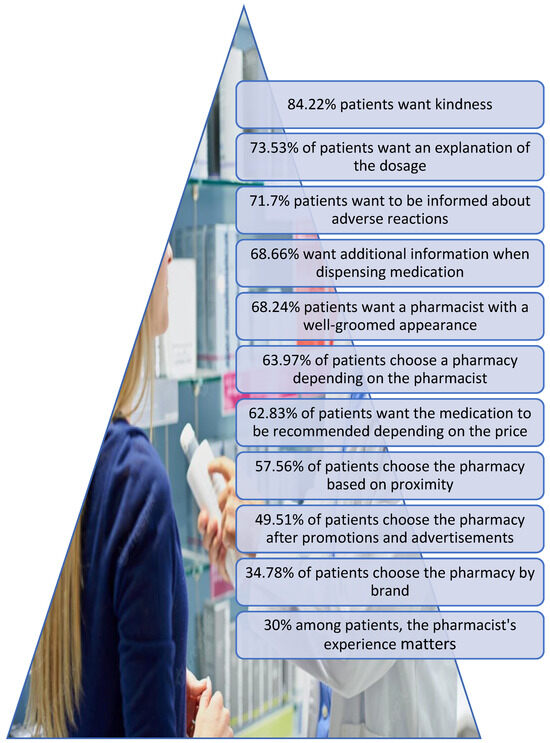 Many of the pharmacists in Romania are convinced that the degree of patient satisfaction is closely related to promotions and prices, but in reality, patient satisfaction is brought about by a multitude of factors. The quality of pharmaceutical services and patient-centered medication can significantly increase the degree of satisfaction and trust in the pharmaceutical act. In the past, another study of 1000 completed questionnaires was also carried out in community pharmacies in Romania, in which it was demonstrated that patients have greater trust in pharmacists when they offer a patient-centered pharmaceutical service [17].