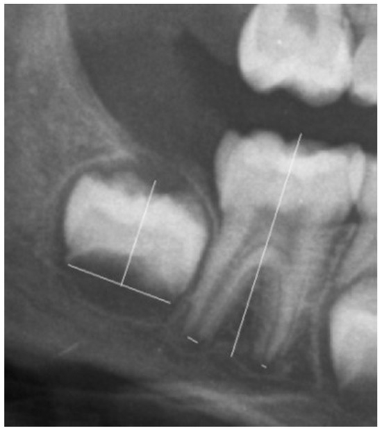 Clinical data were used to detect the best cut-off for 14 years of age. The data used for the survey were processed anonymously and collected by healthcare professionals with prior informed consent, in compliance with laws on confidentiality and protection of personal data. If at least two permanent lower molars were not completely developed, we selected a cut-off following the study on Italian children [6]. The ratio between the distance between the inner sides of the open apex and the tooth length of seven permanent teeth of the left mandibular were measured (Figure 1) [6,7].
