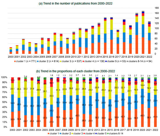 Of the 2308 articles returned by the search strategy, 14 clusters were formed from 2167 papers based on citation relationships. In total, 141 articles were automatically dropped during the clustering process because they had no citation relationship with other articles. The overall number of papers published per year has been on the rise, starting with 26 per year in 2000 and gradually increasing to more than 100 per year in 2011 and more than 160 per year after 2020 (Figure 1a).