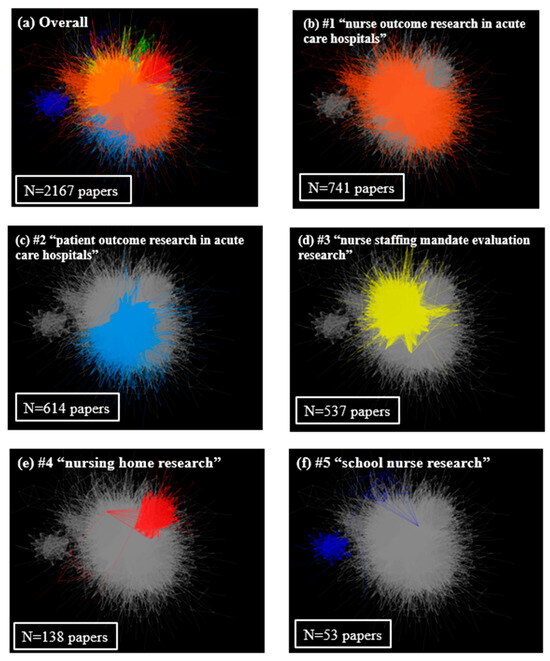 Out of the 14 clusters, the top five clusters comprised 97.5%. The 6th to 14th clusters, thus, only consisted of a total of 54 papers (2.5%). Therefore, in this paper, we discuss only the top five clusters, which included a level of papers that could be interpreted (Figure 2). Cluster #1 was titled “nurse outcome research in acute care hospitals”, Cluster #2 was titled “patient outcome research in acute care hospitals”, Cluster #3 was titled “nurse staffing mandate evaluation research”, Cluster #4 was titled “nursing home research”, and Cluster #5 was titled “school nurse research”. Over the past 20 years, the proportions of each cluster have not changed (Figure 1b).