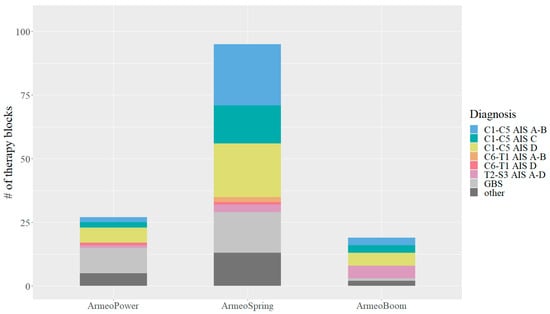 A total of 141 training blocks were recorded, 84 blocks (59.6%) for the right arm and 57 (40.4%) for the left arm. Blocks lasted approximately 6 weeks (median: 6.1 weeks, IQR: 5.4–8.8). The median number of times participants trained with the same device before changing device or discontinuing training was 25 (IQR: 15.8–35.0). Overall, 48.7% and 32.1% of the participants underwent 1 and 2 training blocks of TAULT, respectively. Moreover, 15.4% changed the device after the evaluation of a training block. In total, 89.4% of the participants exercised three times, 2.8% exercised two times, and 2.1% exercised four times per week, while 5.7% had no documented training frequency. Most of the training sessions (81.6%) lasted 25 min, and only 9.9% of the sessions were scheduled for 35 min. For 8.5% of the sessions, the training duration was not recorded. The number of users and the distribution of the different diagnoses across the training devices is shown in Figure 1. Remarkably, the ArmeoSpring was by far the most frequently used device.