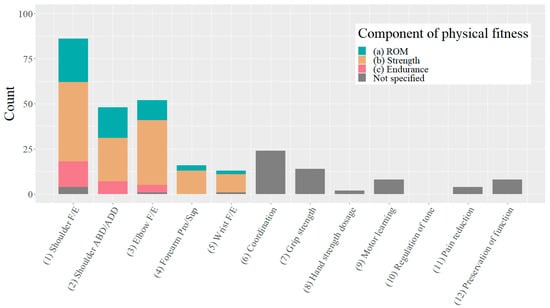 In the ‘body functions’ domain of the ICF, two goals per training block were set by the case-managing therapist using a scoring grid with predefined selection options ((1) to (12)). Hence, 282 goals were evaluated. They mainly aimed at improving the strength to move the shoulder or elbow joint (Figure 2).
