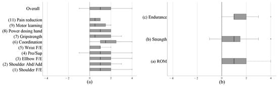Achievement of goals in the ‘body functions’ domain evaluated on an adapted Goal Attainment Scale ranging from −4 to 4 (100% deterioration—100% improvement in performance of the targeted function); (a) ‘body functions’ goals using a grid, (b) component of physical fitness Abd/Add: abduction/adduction; F/E: flexion/extension; Pro/Sup: pronation/supination; ROM: Range of motion.