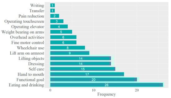 The goals could be assigned to 16 activities (Figure 4). Through discussion, these activities were then grouped into the following six categories: (i) ‘d550 Eating and d560 Drinking’; (ii) ‘d445 Hand and arm use, d440 Fine hand use, and d430 Lifting and carrying objects’; (iii) ‘b760 Control of voluntary movement functions’; (iv) ‘d465 Moving around using equipment’; (v) ‘d510 Washing oneself’; (vi) ‘d540 Dressing’ (Figure 5). The categories were defined as precisely and closely as possible to the participant’s goals and as broadly as necessary to ensure a manageable and practical number of categories. Specific information on what these items include or exclude can be found in the ICF literature [].