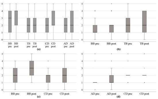 Muscle strength before and after a training block. (a) Overall, (b–d) when the goal in the ‘body functions’ domain was to improve strength in (b) elbow flexion/extension, (c) shoulder flexion, (d) shoulder abduction. BB: biceps brachii; TB: triceps brachii; CD: clavicular part of the deltoid; AD: acromial part of the deltoid.