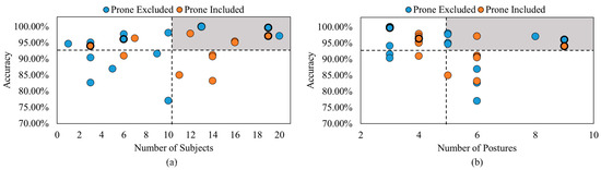 Accuracy comparison between studies that included the prone position and studies that either exclude the prone position or merge it with the supine position (a) versus the number of subjects and (b) versus the number of postures detected [4,8,10,11,23,24,25,26,27,28,29,30,31,32,33,34,35,36,37,38,40,41,42,43,44,45,46,47].