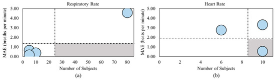 Figure 2a highlights the MAEs of four out of the nine articles on respiratory rate estimation using smart mats or bedsheets [50,55,58,59]. Similarly, 3 of the 12 heart rate articles investigated the MAEs of their smart mats or bed sheets [50,51,54], shown in Figure 2b. The black dashed lines represent the average MAE and number of subjects of all included studies. It should be noted that the vertical black dashed line in Figure 2a is skewed to the higher end of the number of subjects due to the large sample size in [59]. The gray region shows the region of interest, which has a large sample size and low MAE values.