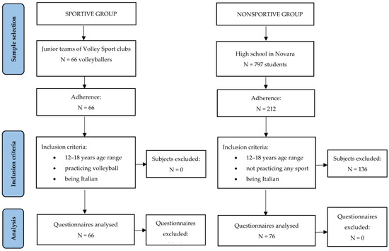 The study was carried out between December 2020 and March 2021 on a convenient sample of 142 Italian adolescents from North Italy, subdivided into two groups, sportive and nonsportive (non-participating in any sport).