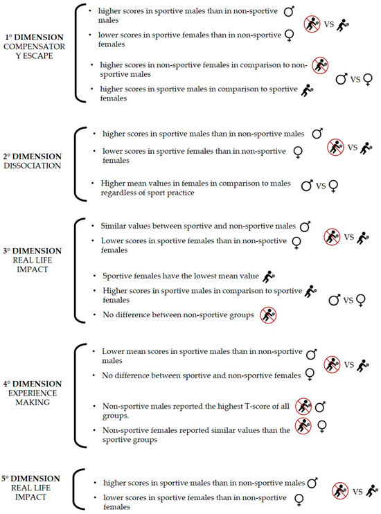 The second aspect that was considered was gender differences. Females tended to show higher mean values than males, except for Real Life impact and Experience Making. For Compensatory Escape, differences between sexes were more evident in the nonsportive group, with females presenting higher values, while in the sportive group, a variegate trend was observed with a tendency to show higher scores in males in comparison to females. Regarding this aspect, the literature shows contrasting results. Di Nicola et al., in their study on Italian adolescents, did not find gender differences for PIU, while problematic gambling was significantly more common in males [62]. Escapism through the Internet may constitute a coping strategy to face adversity, which in some cases can be maladaptive. This process is involved in a wide range of psychological problems, consisting of taking measures to influence or avoid negative experiences as much as possible to regulate emotions. Female gamers showed higher escapism scores associated with more problematic gaming [59]. Females showed a higher tendency to escape and dissociate from reality than males, feeling far from reality when online or having difficulties reducing the time of Internet access. This is in accordance with the results of Deleuze et al., who reported that females had a higher preference for virtual environments than males [53]. It is likely that females are more attracted by social motivations and exploration, while males are more competition-oriented [63,64].