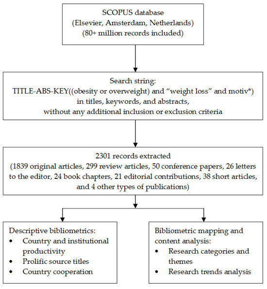 The search was performed in a way to, as closely as possible, achieve the study’s objectives. In this manner, we formed the search string using the keywords focusing only on weight loss in obese or overweight people and motivation. We did not use synonyms as irrelevant publications could be inserted into the corpus. However, we used the wildcard character * and quotation marks. Thus, the subsearch string “weight loss” retrieved all publications containing the words weight loss, losing weight, weight loss, and similar. We assessed the performance of the search string with a recall metric (i.e., the fraction of relevant instances among the relevant instances). In this manner, we formed a list of 30 fundamental publications related to the aim of the study and expected to be found in the corpus and 10 prolific authors. All 10 authors and 29 publications were successfully retrieved.