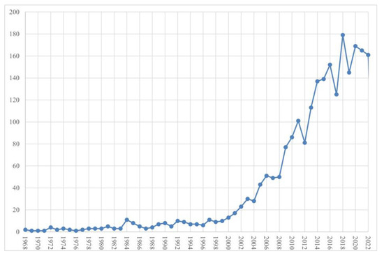 The first publications appeared in 1968; they addressed overeating in a psychiatric population [18] and compared university-attending and non-university-attending populations regarding obesity in young males [19]. Between 1968 and 1989, research production was modest (with a maximum of 11 articles), exhibiting a slightly positive linear trend (Figure 2). The year 2000 saw exponential growth in research productivity that lasted until 2018, when it peaked at 179 articles. Subsequently, a downward trend began, with 160 articles published in 2022. The exponential trend in the new millennium and the volume of research indicates that research on motivation for weight loss is gaining importance and popularity; however, the downward trend in recent years might be a cause for concern.