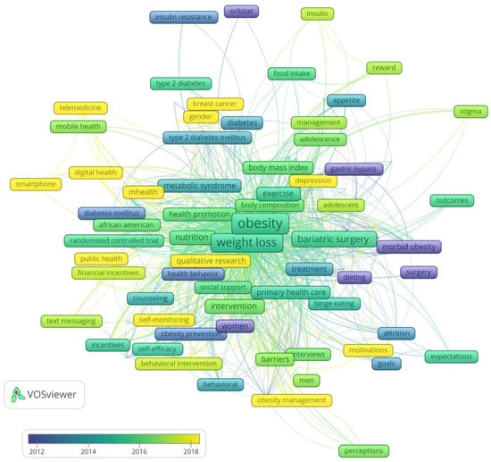 The historical trends are presented in Figure 4. Until 2012, research in the field of weight loss and motivation focused on morbid obesity, body self-image, diet, surgical techniques for weight loss, and the internet as an opportunity to motivate and search for useful information. In the 2012–2014 period, the research focus shifted to the psychological factors of obesity and weight loss in terms of eating habits and health concerns. Research on the association between obesity and diabetes was also initiated. The phenomenon of motivation in connection with behavioral change and obesity/weight loss began to be intensively researched in the 2015–2016 period. During this period, research on bariatric surgery became popular. In the 2017–2018 period, intriguing research was conducted in the fields of behavioral change interventions, motivating changes, and obstacles to weight loss. One of the more interesting concepts that appeared in this period is “self-determination theory”. Research conducted after 2018 has been devoted to the use of digital health, smart technologies, telemedicine, and social media in motivational interventions and weight maintenance. The number of qualitative studies has also increased. Self-control and sleeve gastrectomy are also interesting research trends. A virtual model of weight achievement and intensive treatment employed during COVID-19 is also effective for weight reduction and maintenance [62].