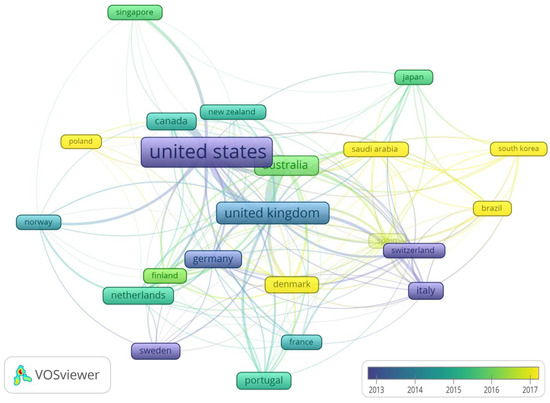 The country cooperation based on co-authorship is shown in Figure 5. Evidently, 22 countries have published 20 or more papers. The United Kingdom and Australia (n = 43), the United States and Canada (n = 28), the United States and the United Kingdom (n = 21), and the United States and Australia (n = 15) were the countries with the highest number of international publications. The most cited publications were from the United States, the United Kingdom, and Australia. The oldest publications were from the United States, Italy, Switzerland, and Sweden, and the youngest from Poland, Denmark, Saudi Arabia, and South Korea (Figure 5). Research cooperation on the motivation for weight loss between developed and less-developed countries is almost nonexistent.