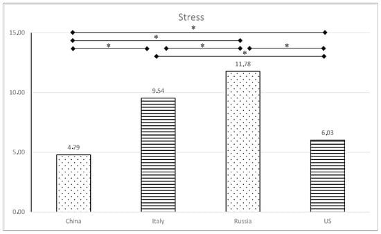 Levels of stress in the four countries. * p < 0.008.