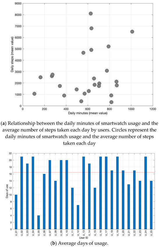 Figure 2a illustrates the relationship between the daily minutes of smartwatch usage and the average number of steps taken each day by Italian users. The majority of users do not exceed an average of 4000 steps per day, regardless of the duration of smartwatch usage. The average total daily steps taken by users is 2724 steps. The mean daily usage of the smartwatch corresponds to 595 min (9.9 h). Considering that the smartwatch requires daily charging (recommended for at least two hours, ideally overnight), the acceptability is high, with an average daily usage of 9.9 h. Figure 2b displays the total number of days of smartwatch usage for each user. The red line represents the average days of usage by all users, which is 16.5 days.