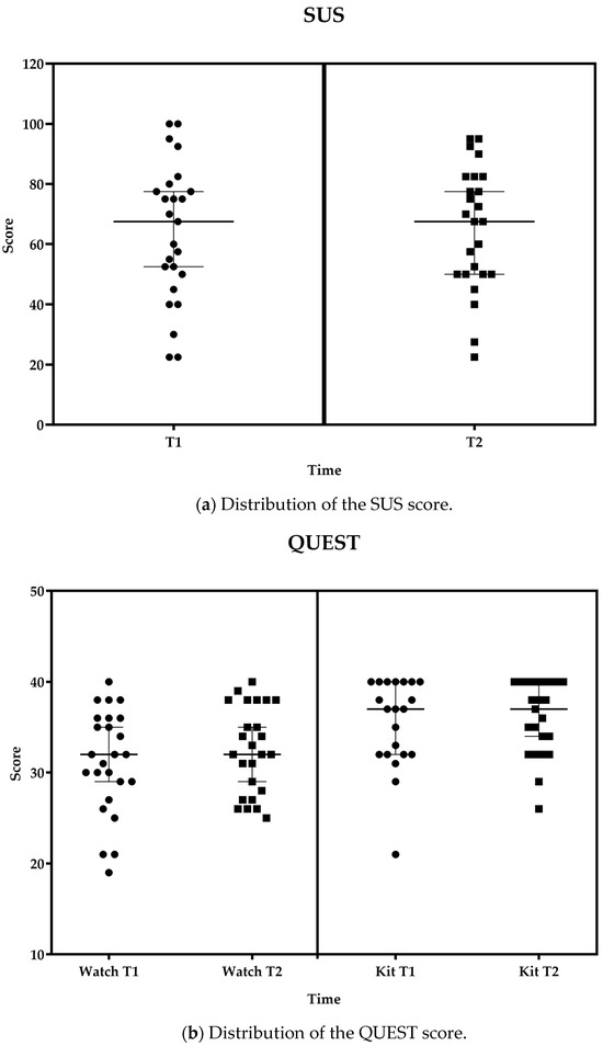 As shown in Figure 3b, the mean QUEST score for the smartwatch varied from 31.2 ± 5.7 at T1 to 32.5 ± 4.8 at T2, and, for the kit of sensors, from 35.4 ± 4.9 at T1 to 36.0 ± 4.1 at T2, indicating a level of ‘quite satisfied’ overall with the system.