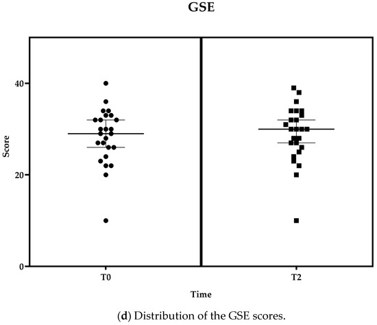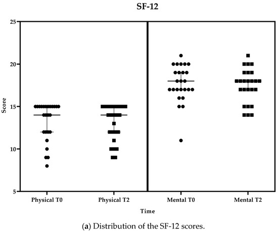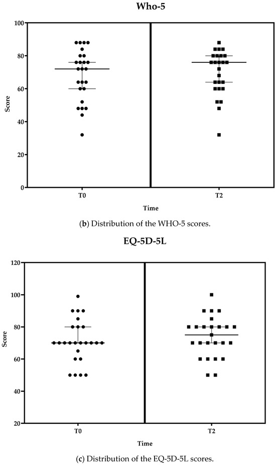 As reported in Figure 5a, without any change in the perceived health status monitored through the SF-12, the state of complete physical, mental, and social well-being, as measured through the WHO-5 Index and the EQ-5D-5L questionnaires, slightly improved over the period, with it ranging from 68.0 ± 15.7 to 69.4 ± 13.7 in the case of WHO-5 (Figure 5b) and from 71.2 ± 13.5 to 74.0 ± 12.7 in the case of EQ-5D-5L (Figure 5c). Self-efficacy as the set of beliefs about the ability to complete a certain task was measured through the short version of the GSE self-efficacy scale, and it remained stable (Figure 5d).