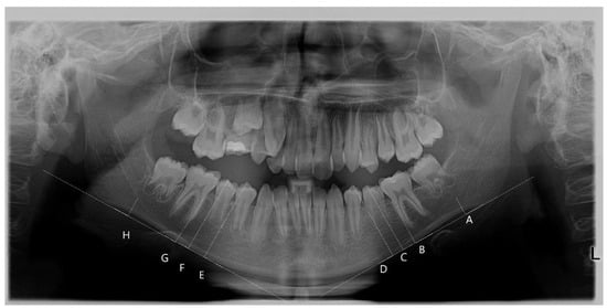 Panoramic radiograph showing the sites (A–H) where measurements of the width of the cortical bone were performed. Lines were drawn perpendicular to a tangent at the lower border of the cortex to the inner border of the cortex at A and H (the deepest points of the antegonial notch concavity), at the cementoenamel junction of the crown of the first molar (B, G) and at the highest cusp of the premolars (C–F). The width of the cortex was measured along these lines.