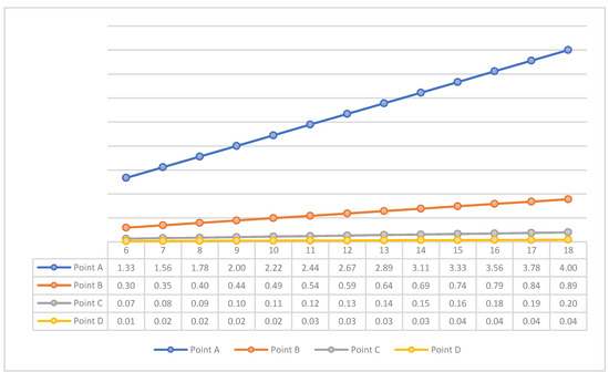 A statistically significant positive relationship was found between all points assessing bone thickness and age (years), meaning that as age increases, bone thickness increases accordingly (p < 0.001) (Figure 2). Multiple comparisons between total bone thickness and age groups resulted in statistically significantly lower mean values in children ages 8–9 compared to children ages 14–15 years (mean difference: −0.9449, p-value = 0.010) and children ages 18 years (mean difference: −1.1412, p-value = 0.046).