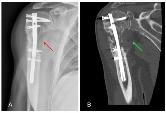 X-ray and CT scan at 2-month FU: (A) antero-posterior radiograph of the shoulder showing an area of extensive humeral metadiaphyseal osteolysis (red arrow); (B) CT image of the shoulder in coronal section documenting the presence of pathological tissue at the periskeletal level in the postero-medial aspect of the arm (green arrow).