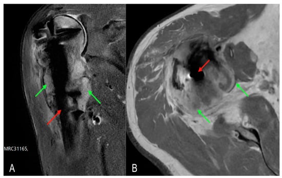 MRI scans of the left arm showing intramedullary nail (red arrow) and periskeletal neoplastic pathological tissue (green arrows) at the level of the humeral head and diaphysis: (A) coronal MRI section; (B) transversal MRI section.