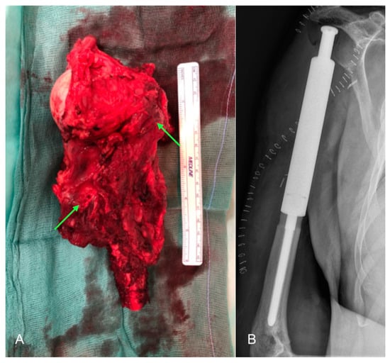 Intraoperative image and post-operative X-ray: (A) Resection of the proximal two thirds of the left humerus with a neoplastic mass surrounding the humeral head and part of the diaphysis (green arrows); (B) postoperative antero-posterior X-ray of the left arm showing the implanted mega prosthesis.