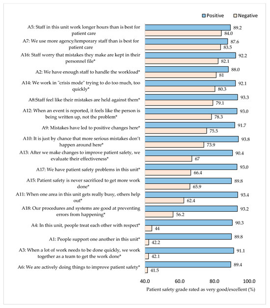 Participants who were positive that people support one another in their unit gave a positive rating for safety culture (89.8%), which was higher compared to those who were negative about people supporting one another in their unit (42.2%) (p < 0.001) (Figure 1). Participants who supported working together as a unit to complete work quickly, treating each other with respect and actively doing things to improve patient safety provided a better patient safety grade at the hospital (p < 0.001) compared to those participants who did not consider these items as important. Participants who did not report patient safety problems on their unit provided a better patient safety grade for the hospital (93.0%) compared to those who believed that there were problems in their unit (66.4%) (p < 0.001). Staff who believed their mistakes were held against them were more likely to report higher overall patient safety grade ratings (93.3%) compared to those who did not (79.1%) (p < 0.001). There were no statistically significant differences among staff who perceived that their unit works longer hours and uses more agency/temporary staff than is best for patient care compared to staff who did not hold this perception.