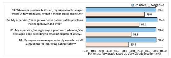 Percentage of overall patient safety grade (very good/excellent) based on positive or negative feedback related to feedback on supervisor/manager. * Significant difference between positive and negative groups p < 0.05.