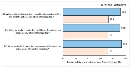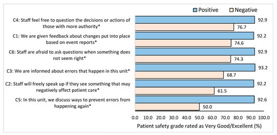 Percentage of overall patient safety grade (very good/excellent) based on positive or negative feedback related to the frequency of events reported. * Significant difference between positive and negative groups p < 0.05.