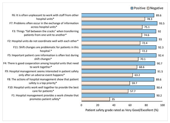Percentage of overall patient safety grade (very good/excellent) based on positive or negative feedback related to the hospital. * Significant difference between positive and negative groups p < 0.05.