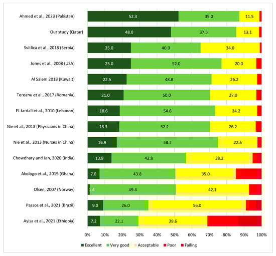 Overall patient safety grade in our study compared to other studies in hospitals [,,,,,,,,,,,].