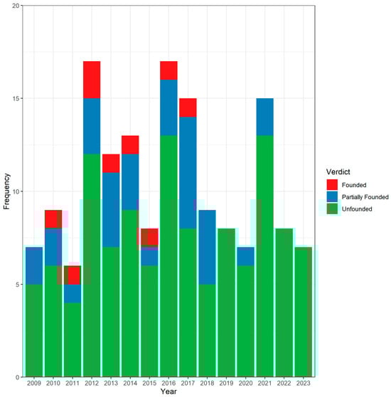 Data analysis was performed using R Statistical Software version 4.2.2. (R Foundation for Statistical Computing, Vienna, Austria). Categorical data were presented as frequencies (%), and numerical data as median with interquartile range (IQR). We used Spearman’s Rho to determine whether the frequency of the number of alleged cases has remained stable over time. Differences in characteristics were compared between unfounded and (partially) founded verdicts using chi-squared tests for categorical data and the Wilcoxon signed rank rest for non-normal continuous data. Statistical significance was set at a p-value less than 0.05.