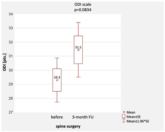 APA StyleMichalak, M., Druszcz, A., Miś, M., Paprocka-Borowicz, M., & Rosińczuk, J. (2023). Quality of Life, Disability Level, and Pain Intensity among Patients after Lumbar Disc Surgery: An Observational Three-Month Follow-Up Study. Healthcare, 11(24), 3127. https://doi.org/10.3390/healthcare11243127
