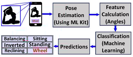 For the study, the Yoga-82 dataset developed in [34] containing 82 yoga pose classes with images downloaded from the web, including various camera angles, was used with MLKit Pose Detection to detect a subject’s body pose in real time from continuous videos or static images, utilizing skeletal landmark points for calculating the pose angles.